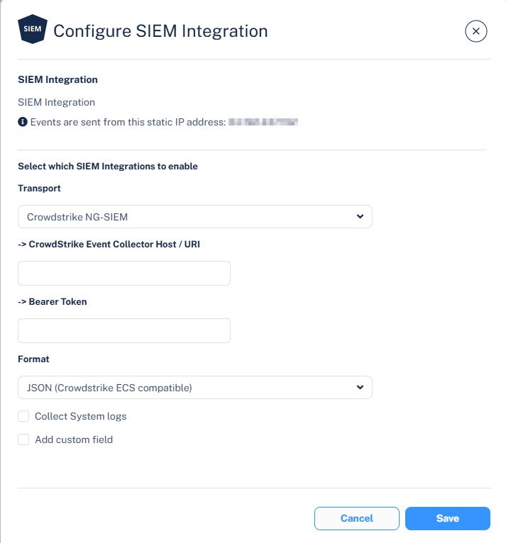 To allow SIEM to collect your system logs, select the Collect System logs checkbox.