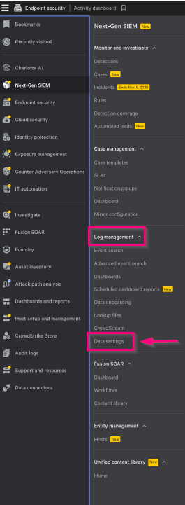Click the Menu icon and go to Next-Gen SIEM > Log management > Data settings.