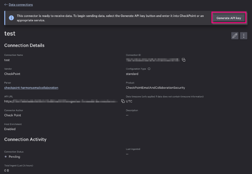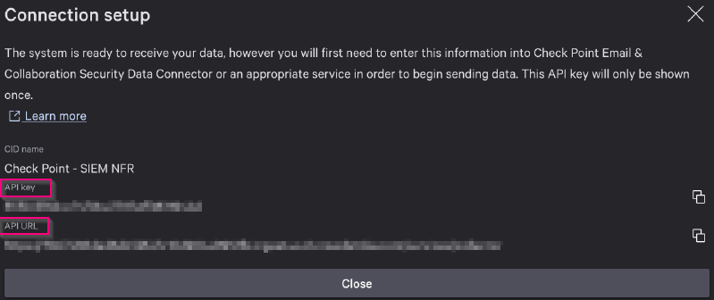 In the Connection setup page, copy the API URL and API Key to configure SIEM integration.