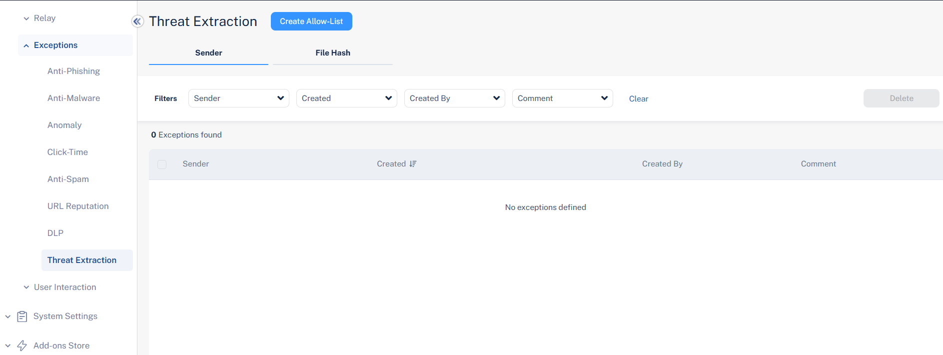 2. From the left navigation panel, go to Security Settings > Exceptions > Threat Extraction.
