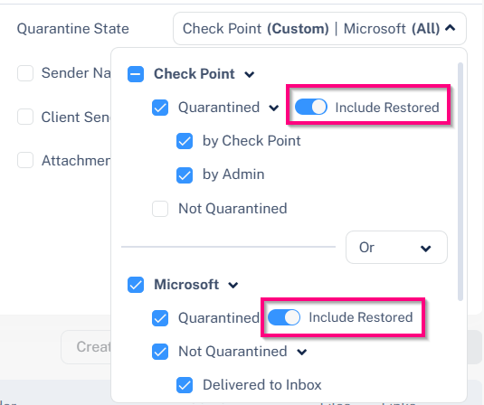 In the Quarantine State section, enable the Include Restored toggle for Avanan and Microsoft.