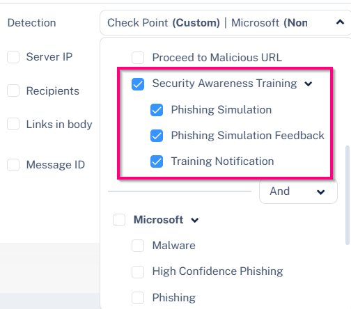 In the Detection section, select the Security Awareness Training checkbox in the Avanan detection filter.