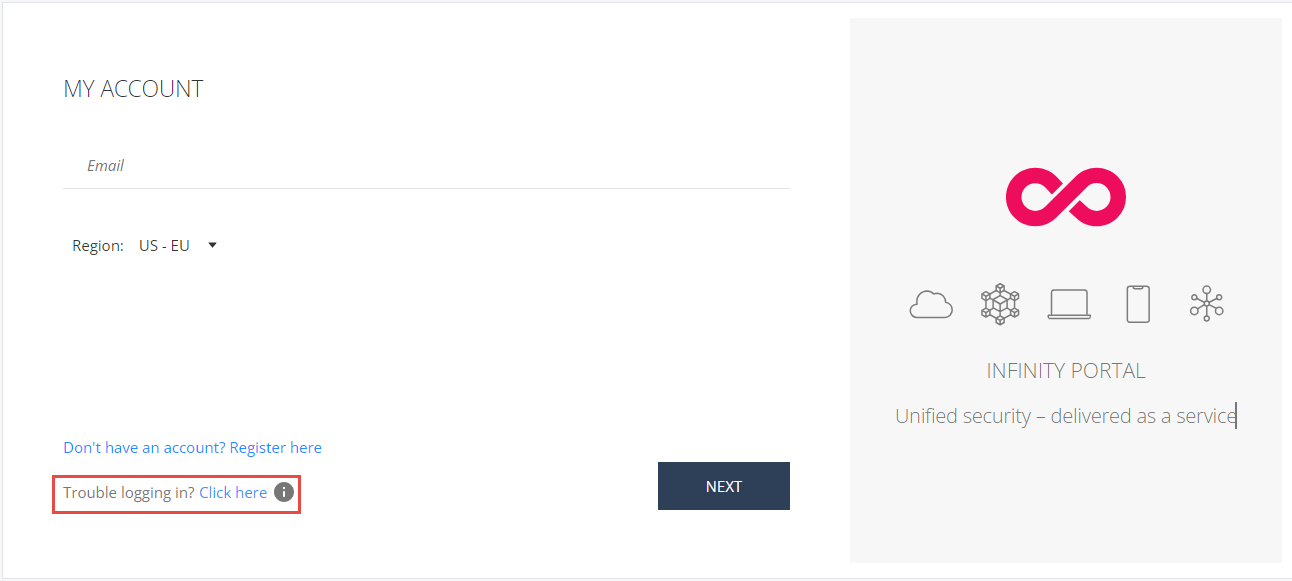 On the Infinity Portal login page, to the right of Trouble logging in, click the Click here button.