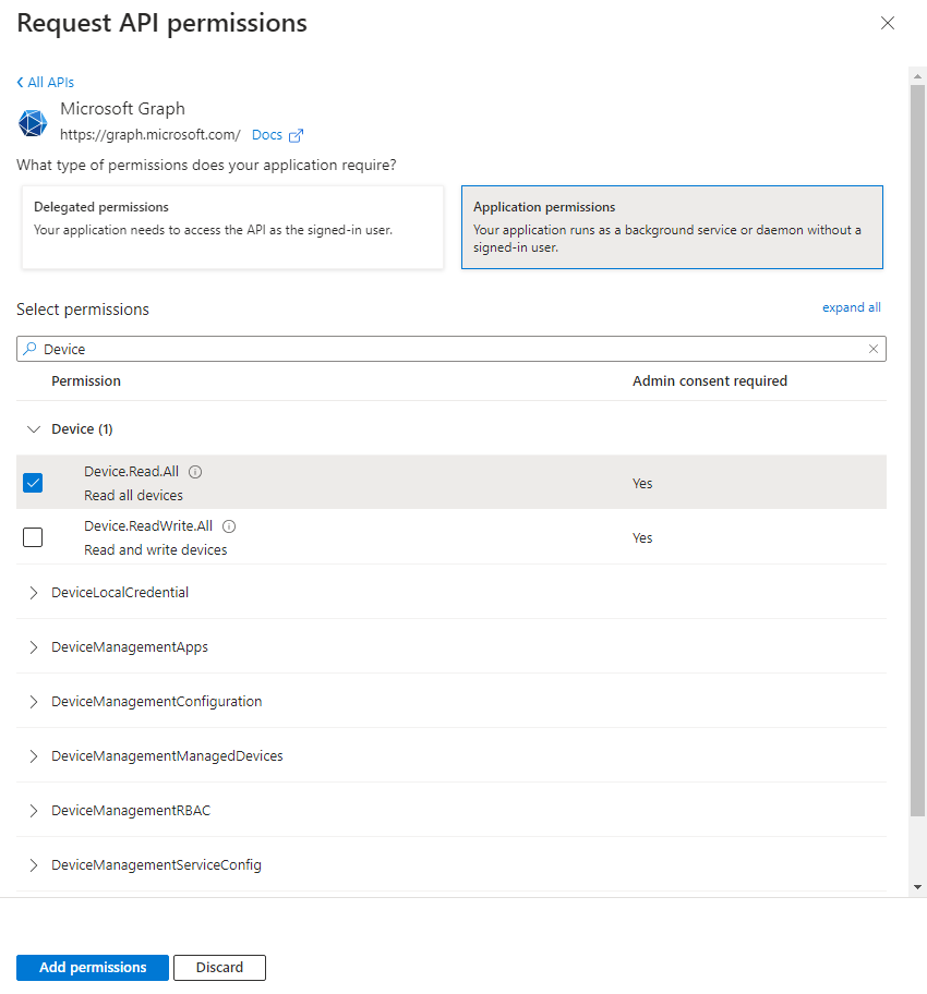 In Microsoft APIs, click Microsoft Graph and select Application permissions.