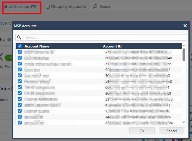 To view data for specific MSP accounts, click All Accounts and select the required accounts.