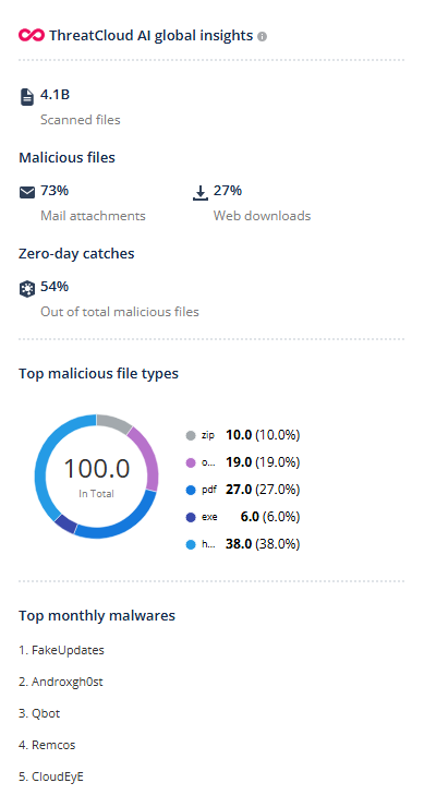 The ThreatCloud AI global insights widget shows global insights related to file security from the ThreatCloud AI. It includes: