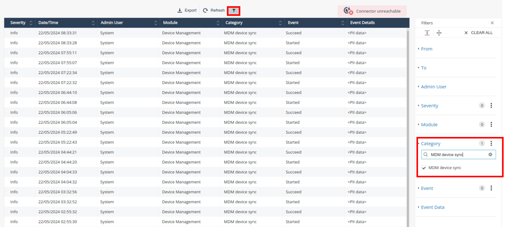 2. In the Filters panel on the right, expand Category and filter for MDM device sync.