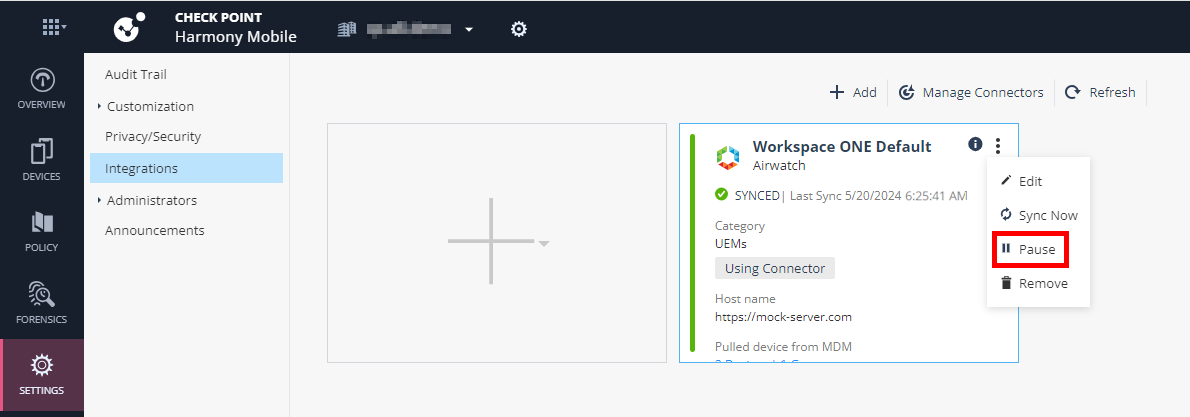 12. Go to Harmony Mobile Administrator Portal > Settings > Integrations and update the Connector Configuration with R81.20 VM information: