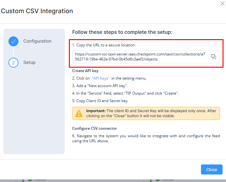 Important - Save the Client ID and Secret Key in a secure location. These credentials are displayed only once and cannot be retrieved after you click Close.