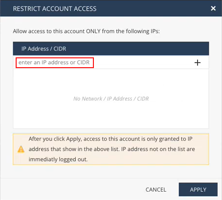 In the Restrict Account Access window, below IP Address / CIDR, enter a public IP address or a range of public IP addresses (CIDR). For example,