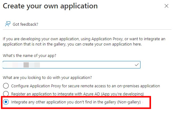 In the What’s the name of your app field, enter a name for the application (example: "Check Point Portal") and click Integrate any other application you don’t find in the gallery (Non-gallery).