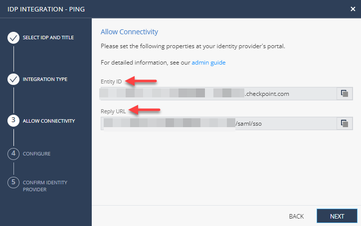 Step 1 - In the Check Point Portal, copy values and finish the IdP Integration Wizard: