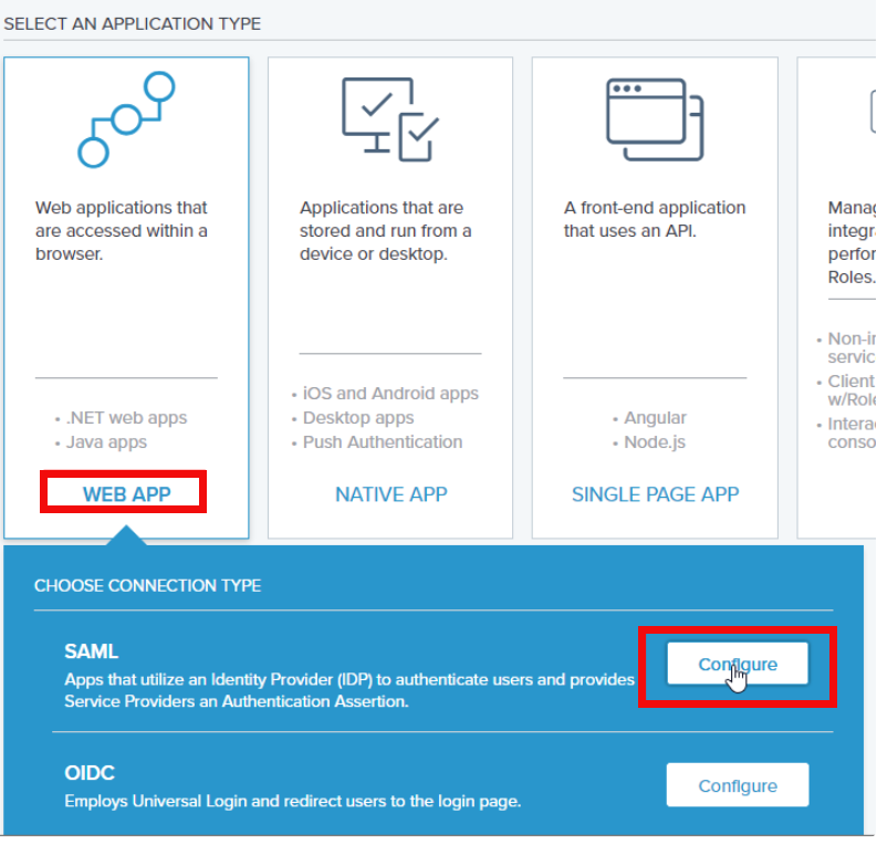 Click WEB APP, then select SAML and click Configure.