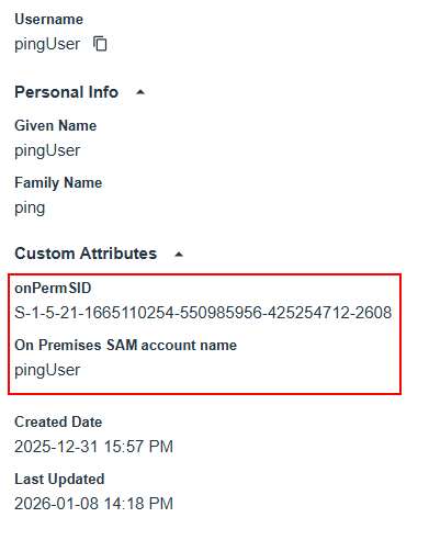 To test the mapping, go to Directory > Users and select an AD user. The SID data appears under Custom Attributes.