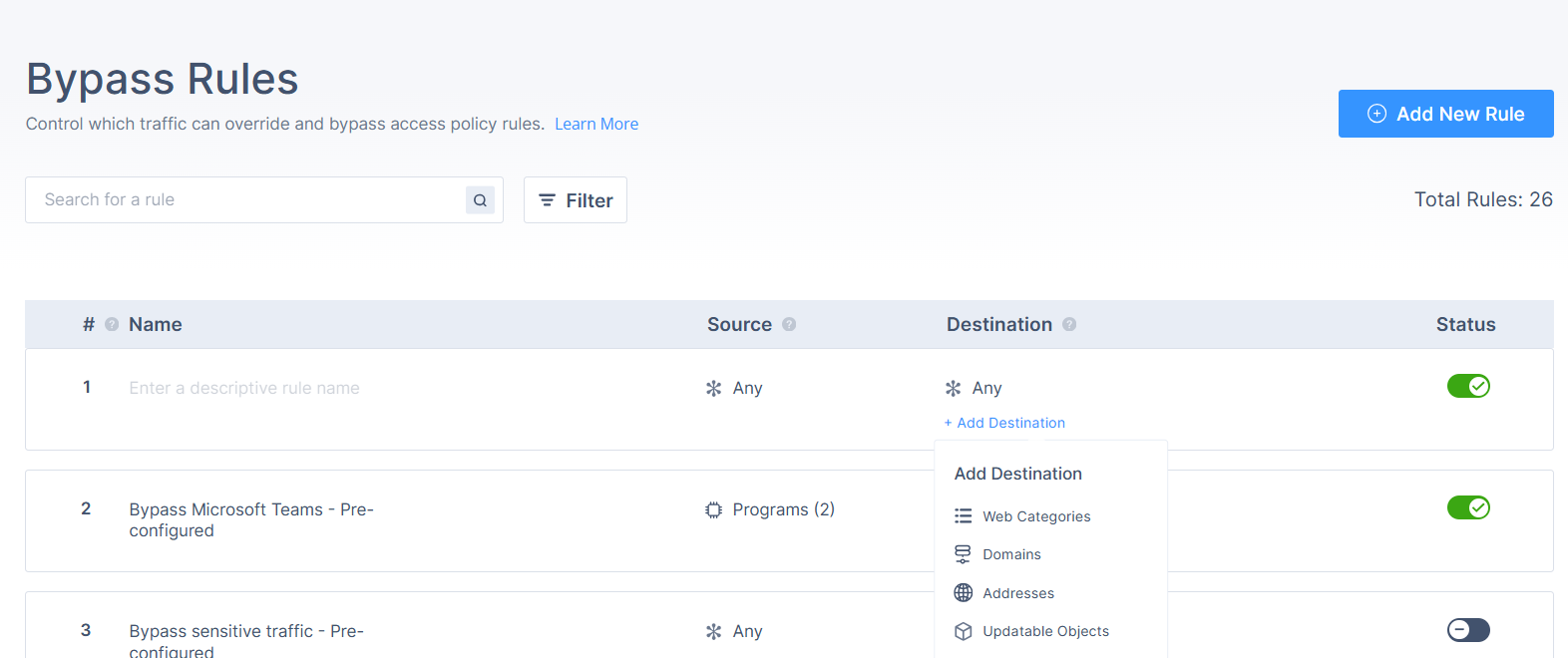 To view the Bypass Rules page, access the SASE Administrator Portal and click Internet Access > Bypass Rules.