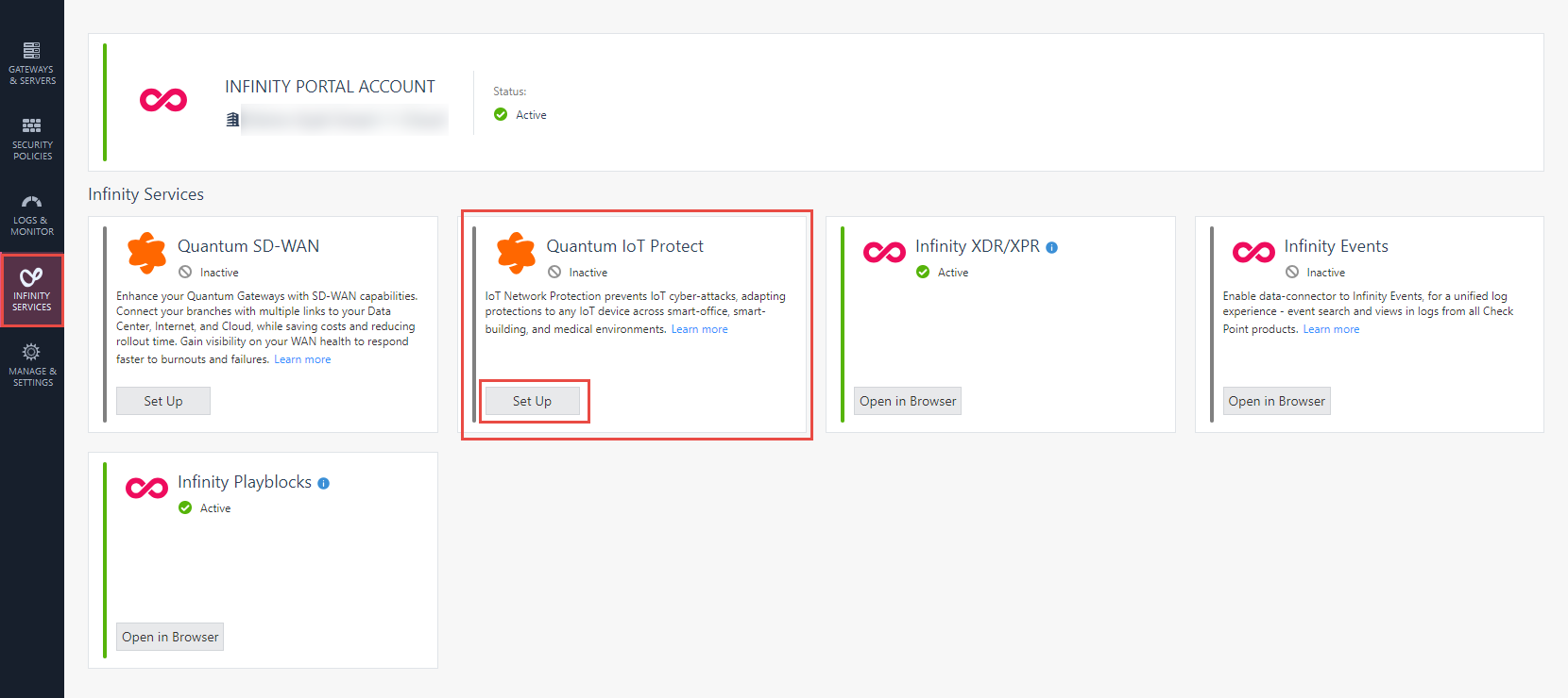Navigate to Infinity Services and in the Quantum IoT Protect widget, click Set Up.